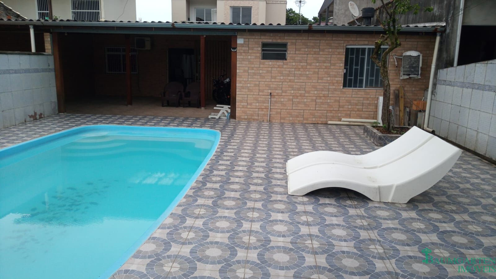 Área de lazer com churrasqueira e piscina,